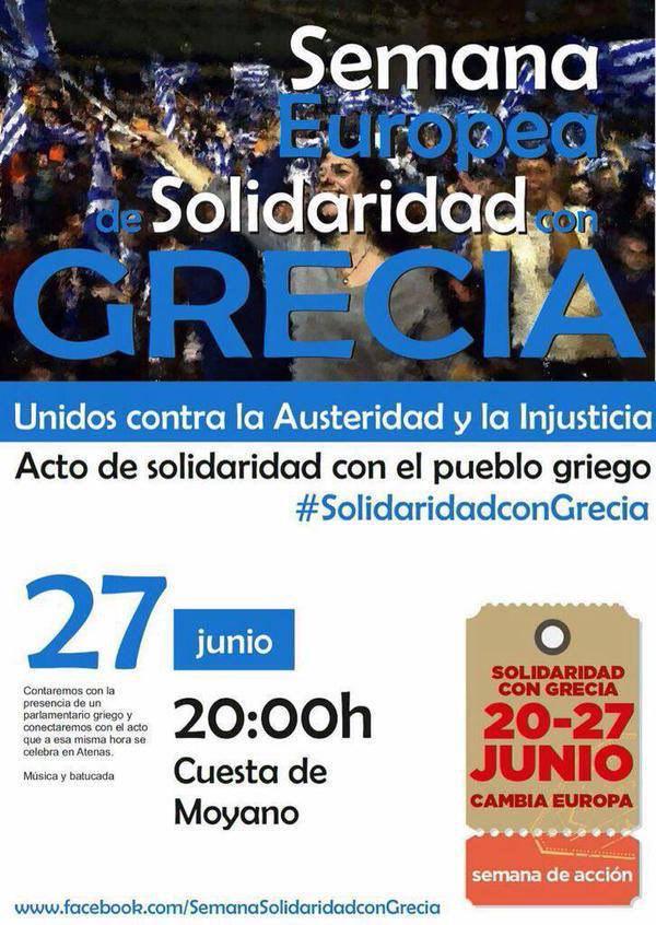 «Η γενναία ελληνική κυβέρνηση δίνει το λόγο στο λαό της. Δημοκρατία είναι όταν ο κόσμος αποφασίζει και για τα σημαντικά οικονομικά ζητήματα» αναφέρουν οι Podemos και στηρίζουν συγκέντρωση υπέρ του ελληνικού λαού στη Μαδρίτη, από κοινού με άλλα κόμματα και φορείς και στο πλαίσιο μιας «Ευρωπαϊκής Εβδομάδας Αλληλεγγύης στην Ελλάδα».