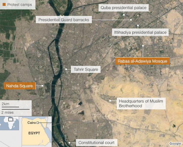Υπενθυμίζεται ότι η κυβέρνηση και ο αιγυπτιακός Τύπος κατηγορούσαν τους υποστηρικτές του Μοχάμεντ Μόρσι ότι είναι τρομοκράτες που έχουν συγκεντρώσει όπλα στις δύο πλατείες και ότι χρησιμοποιούν γυναίκες και παιδιά ως ανθρώπινες ασπίδες, ενώ η Μουσουλμανική Αδελφότητα επέμενε ότι οι συγκεντρώσεις ήταν ειρηνικές.