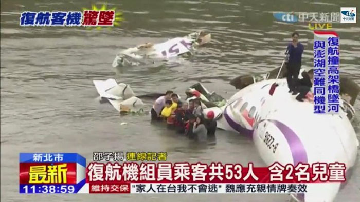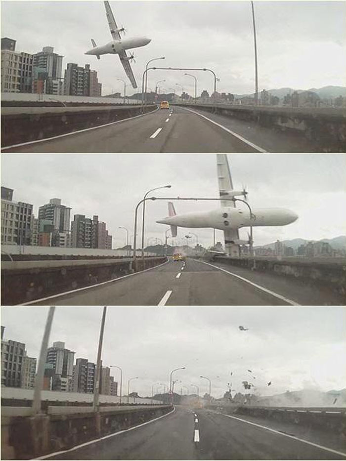 Ερασιτεχνικά video δείχνουν το αεροπλάνο της TransAsia να χάνει ύψος και τμήμα της ουράς και του φτερού να έρχονται σε επαφή με την άκρη της γέφυρας, πριν τελικά το αεροσκάφος συντριβεί στα νερά του ποταμού.
