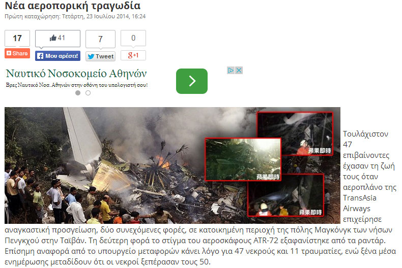 Την ίδια στιγμή τα μέσα κοινωνικής δικτύωσης έχουν κατακλυστεί με φωτογραφίες από την αεροπορική τραγωδία, ορισμένες από τις οποίες δείχνουν το ταξί πάνω στο οποίο προσέκρουσε το φτερό του αεροπλάνου της TransAsia.