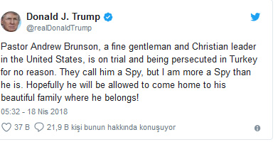 Ένας καλός Αμερικανός πολίτης, χριστιανός ηγέτης, ο ιερέας Άντριου Μπράνσον, δικάζεται αδίκως στην Τουρκία. Τον αποκαλούν πράκτορα, αλλά εγώ είμαι περισσότερο πράκτορας από αυτόν. Ελπίζω να του επιτραπεί να επιστρέψει σπίτι του και στην οικογένειά του όπου ανήκει.