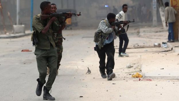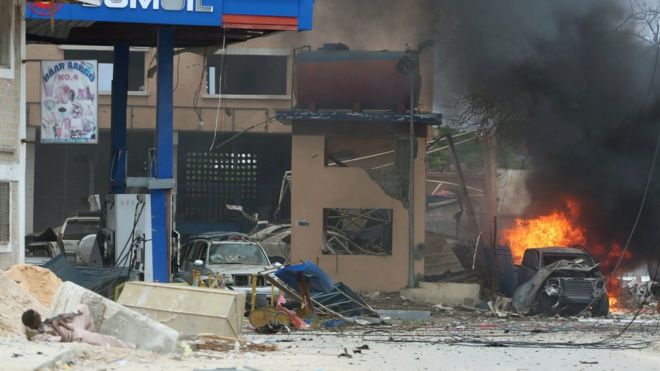Το ξενοδοχείο Naasa Hablood όπου συχνάζουν πολιτικοί και μέλη της Διασποράς, στο βόρειο Μογκαντίσου, ήταν ο στόχος της επίθεσης που πραγματοποιήθηκε με εκρηκτικά και αυτόματα όπλα.