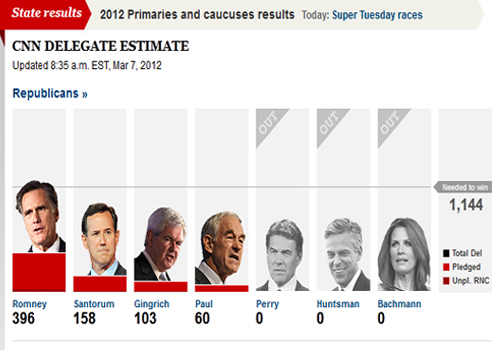 Με τα μέχρι στιγμής αποτελέσματα ο πρώην κυβερνήτης της Μασαχουσέτης προηγείται στην κούρσα των εκλεκτόρων με 396, με τον Rick Santorum να ακολουθεί με 158. Στην τρίτη θέση βρίσκεται ο Newt Gingrich με 103 και τέταρτος είναι ο Ron Paul με 60.