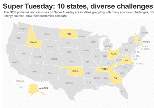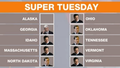 Ο Mitt Romney σημείωσε νίκες στη Βιρτζίνια, στο Βέρμοντ, στο Οχάιο και στο Αϊντάχο ενώ αναμενόμενη ήταν η επικράτησή του στη Μασαχουσέτη, πολιτεία στην οποία είχε διατελέσει κυβερνήτης.