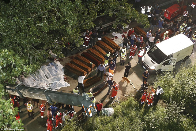Οι 33 από τις 38 σοροί βρέθηκαν μέσα στο λεωφορείο, ενώ οι υπόλοιπες βρίσκονταν κάτω από τις ρόδες.