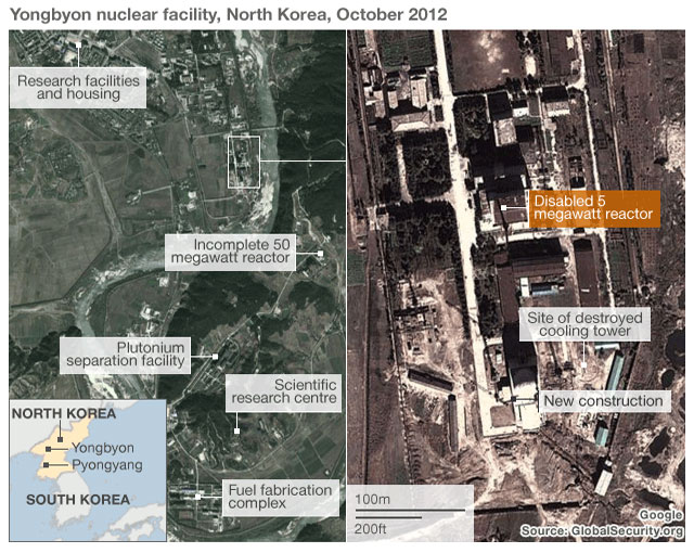 Εν τω μεταξύ την Τρίτη η Πιονγκγιάνγκ ανακοίνωσε το σχέδιό της να ενεργοποιήσει εκ νέου το πυρηνικό εργοστάσιο στην περιοχή Γιόνγκπιον στο βόρειο τμήμα της χώρας, εγκατάσταση που είχε τεθεί εκτός λειτουργίας τον Ιούλιο του 2007, όταν και ξεκίνησαν οι διαπραγματεύσεις για την καταστροφή του πυρηνικού της οπλοστασίου σε αντάλλαγμα της παροχής ανθρωπιστικής βοήθειας.
