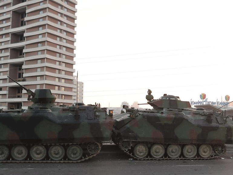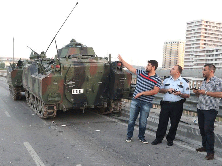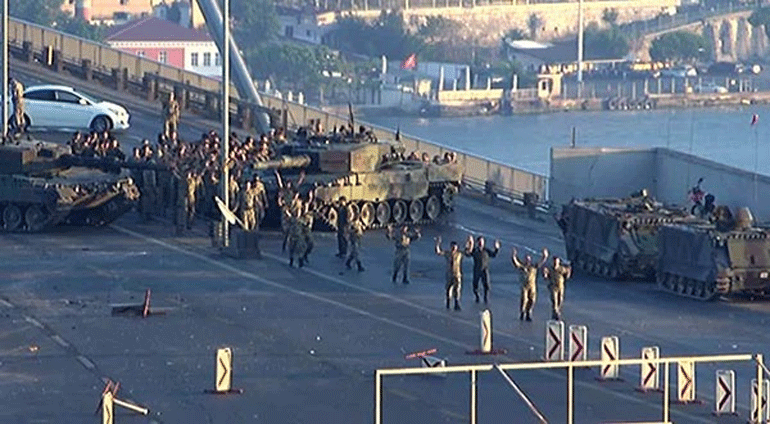 Τα τουρκικά ΜΜΕ μετέδωσαν το πρωί του Σαββάτου εικόνες από τη γέφυρα του Βοσπόρου, όπου δυνάμεις του στρατού παραδίδουν τον οπλισμό τους και προχωρούν με τα χέρια ψηλά μπροστά από τεθωρακισμένα.