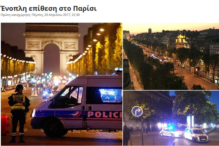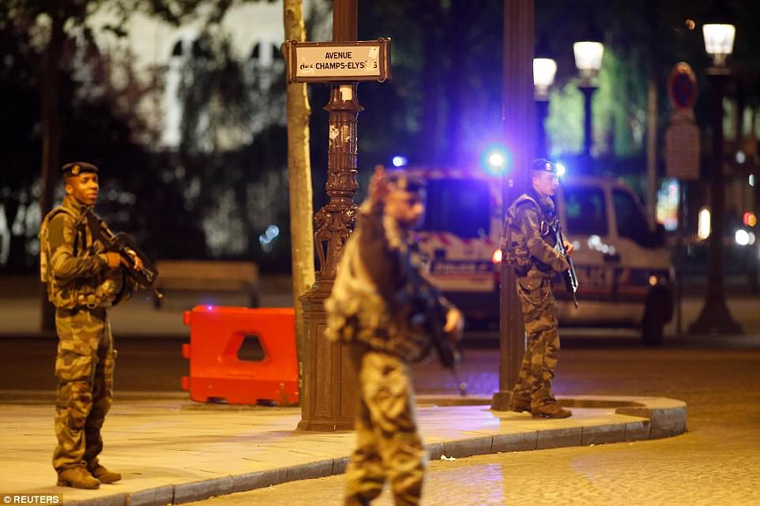 Ένοπλοι επιτέθηκαν το βράδυ της Πέμπτης με καλάσνικοφ κατά αστυνομικών στα Ηλύσια Πεδία, αντηλλάγησαν πυροβολισμοί, ένας εκ των τρομοκρατών και ένας αστυνομικός έπεσαν νεκροί. Τζιχαντιστές ανέλαβαν την ευθύνη της επίθεσης μέσω του πρακτορείου Amaq.