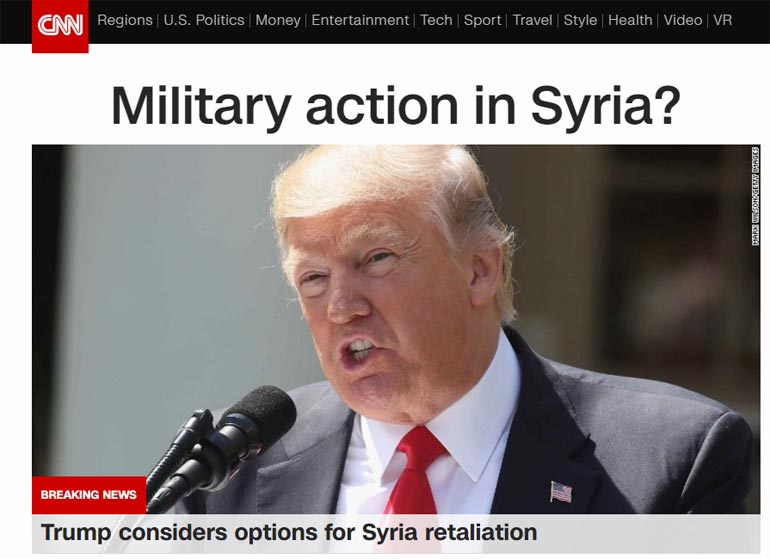 Νωρίς το απόγευμα της Πέμπτης, με έκτακτη ανακοίνωση του το CNN ανέφερε ότι ο Τραμπ συζήτησε το ενδεχόμενο στρατιωτικής δράσης με κάποια μέλη του Κογκρέσου, ως αντίποινα για την πρόσφατη χημική επίθεση, ενώ τόνισε ότι «αναγνωρίζει τη σοβαρότητα της κατάστασης». Όπως αναφέρει ακόμα το αμερικάνικο δίκτυο, ο Πρόεδρος δεν έχει λάβει ακόμα τις αποφάσεις του, αλλά συζητάει τις επιλογές του με τον υπουργό Εθνικής Άμυνας James Mattis και, όπως αναφέρει πάντα το CNN, «οι αποφάσεις εξαρτώνται από την κρίση του υπουργού».