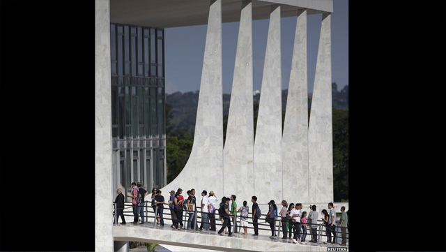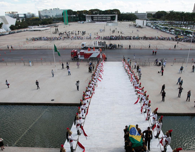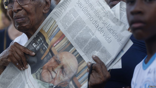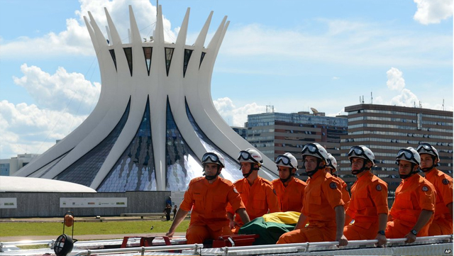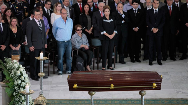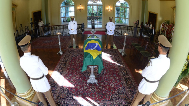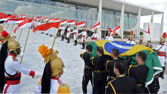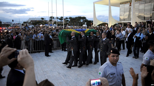 Το φέρετρο με τη σορό του πέρασε από τους κεντρικούς δρόμους της πρωτεύουσας, Μπραζίλια, πριν το πυροσβεστικό όχημα πάνω στο οποίο ήταν τοποθετημένο σταματήσει μπροστά στο εμβληματικό κτήριο του προεδρικού μεγάρου.