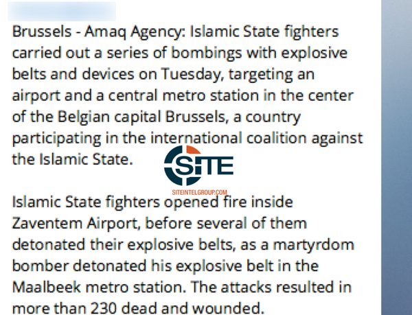 «Οι μαχητές του Ισλαμικού Χαλιφάτου πραγματοποίησαν μια σειρά βομβιστικών επιθέσεων, με ζώνες και συσκευές εκρηκτικών, την Τρίτη, στοχεύοντας στο αεροδρόμιο και στον κεντρικό σταθμό του μετρό στο κέντρο της πρωτεύουσας του Βελγίου, τις Βρυξέλλες, μια χώρα που συμμετέχει στον διεθνή συνασπισμό κατά του Ισλαμικού Χαλιφάτου.