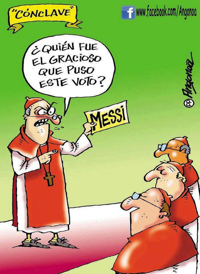 Με αφορμή την ισπανική επικαιρότητα, δηλαδή τη χθεσινή νίκη της Μπαρτσελόνα επί της Μίλαν με τον Μέσι να πετυχαίνει τα δύο από τα τέσσερα νικητήρια γκολ της ομάδας του και τη σύγκλιση του κονκλαβίου για την ανάδειξη του νέου Πάπα, οι Ισπανοί γελοιογράφοι… παίζουν μπάλα.