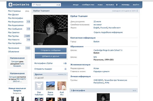 (To προφίλ του Τζοκάρ Τσαρνάεφ σε ρωσική ιστοσελίδα κοινωνικής δικτύωσης)