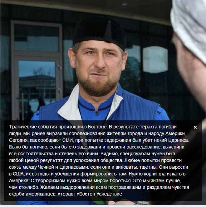 Οποιαδήποτε προσπάθεια να γίνει σύνδεση μεταξύ της Τσετσενίας και των Τσαρνάεφ, αν τελικά είναι ένοχοι, είναι μάταιη. Γαλουχήθηκαν στις Ηνωμένες Πολιτείες και οι συμπεριφορές τους και τα πιστεύω τους διαμορφώθηκαν εκεί. Είναι ανάγκη να αναζητήσει κανείς τις ρίζες του κακού στην Αμερική. Όλος ο κόσμος πρέπει να πολεμήσει την τρομοκρατία. Το ξέρουμε καλύτερα από τον καθένα. Ευχόμαστε σε όλα τα θύματα ταχεία ανάρρωση και συμμεριζόμαστε τα αισθήματα θλίψης των Αμερικανών.