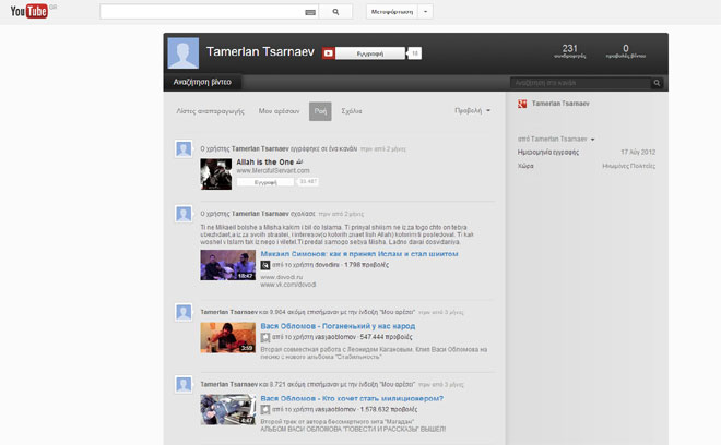 (Το προφίλ του Ταμερλάν Τσαρνάεφ στο Youtube)