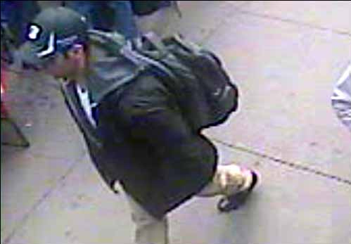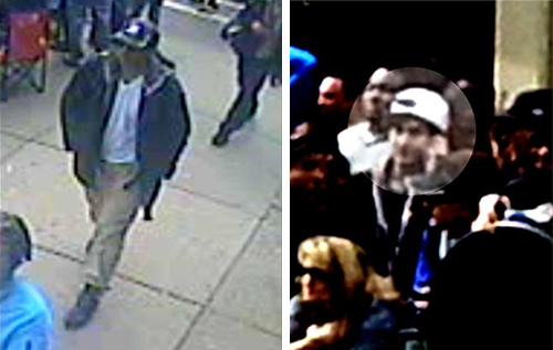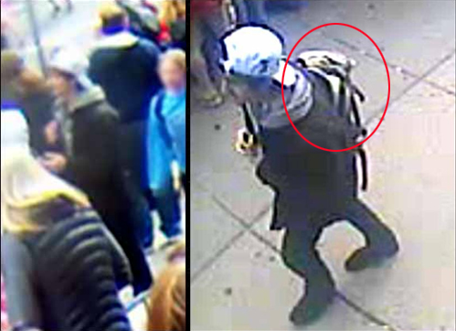 Οι φωτογραφίες στηρίζονται σε οπτικοακουστικό υλικό από κάμερα ασφαλείας ενός πολυκαταστήματος, με τους δύο υπόπτους να φαίνεται πως κατευθύνονται προς τη γραμμή τερματισμού, την ίδια στιγμή που αυτός με το λευκό καπέλο αφήνει μια τσάντα, χρώματος γκρι – λευκού, μπροστά από το εστιατόριο «Forum», όπου και σημειώθηκε η δεύτερη έκρηξη.