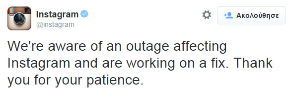 Το Instagram ενημέρωσε τους χρήστες μέσω Twitter ότι γνωρίζουν το πρόβλημα, προσπαθούν να το φτιάξουν και ευχαριστούν για την υπομονή που δείχνουν οι χρήστες.