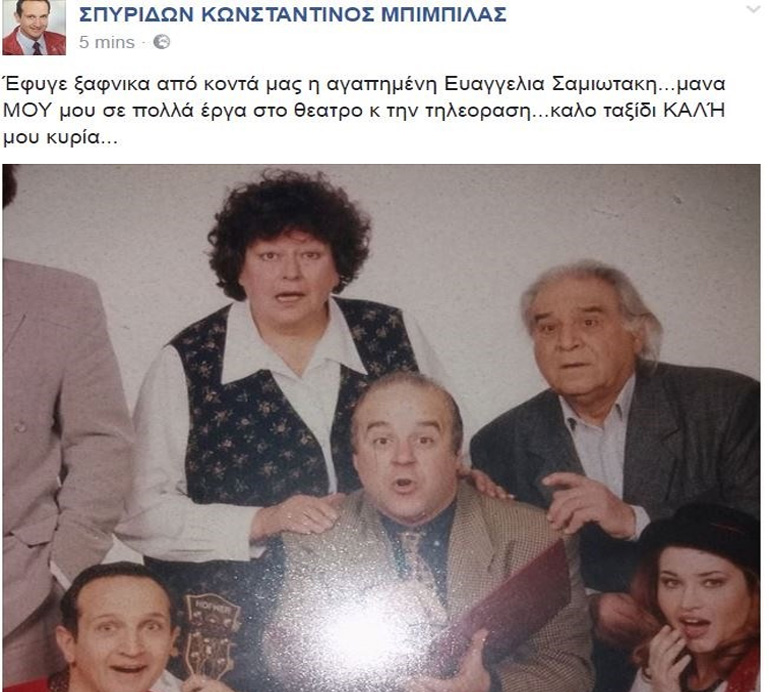 Η ηθοποιός έφυγε σκορπίζοντας θλίψη στην οικογένεια και στους συναδέλφους της. Ο Σπύρος Μπιμπίλας ανακοίνωσε τη δυσάρεστη είδηση στο Facebook: