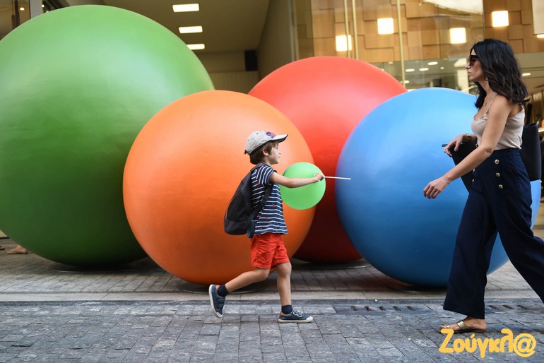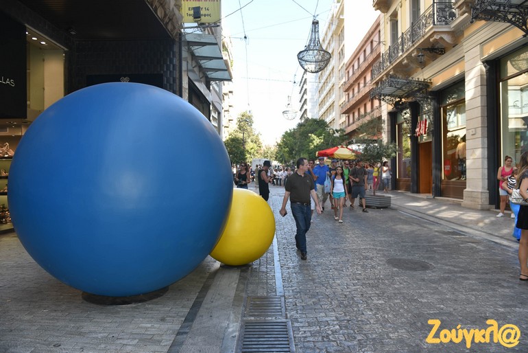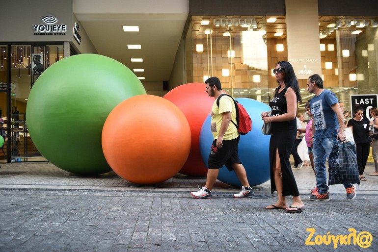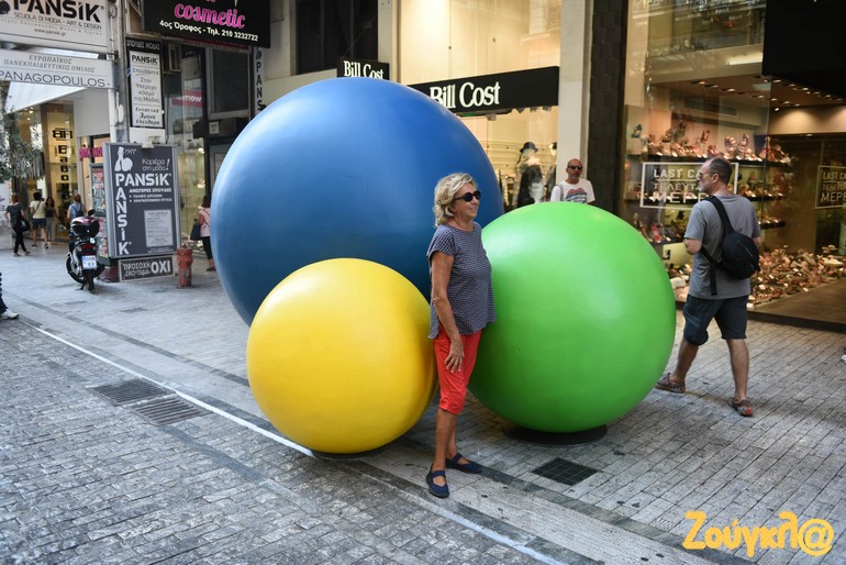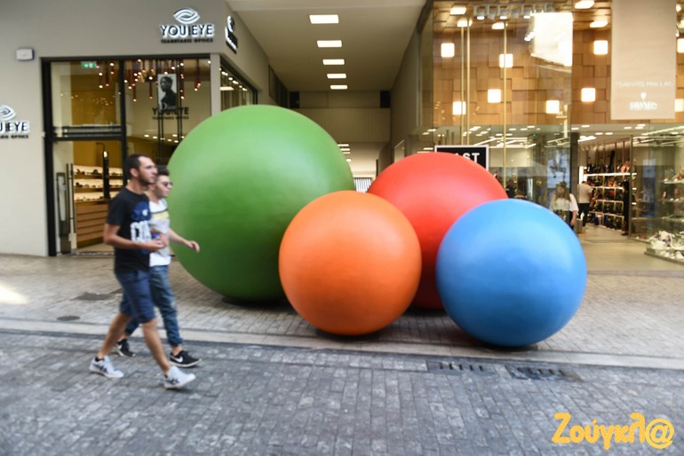 Πρόκειται για επτά (ιερός αριθμός!) γιγαντιαίες μπάλες, διαφόρων μεγεθών και διαμέτρου μέχρι 2,5 μέτρων, κατά μήκος του εμπορικού δρόμου, σε χρώματα πράσινο, κόκκινο, μπλε, πορτοκαλί, γαλάζιο και κίτρινο! Δεν είναι λίγοι οι περαστικοί, Έλληνες και τουρίστες, που κοντοστέκονται να βγάλουν φωτογραφίες μαζί τους και να θέσουν στους εαυτούς τους αλλά και στους γύρω τους το μεγάλο ερώτημα: