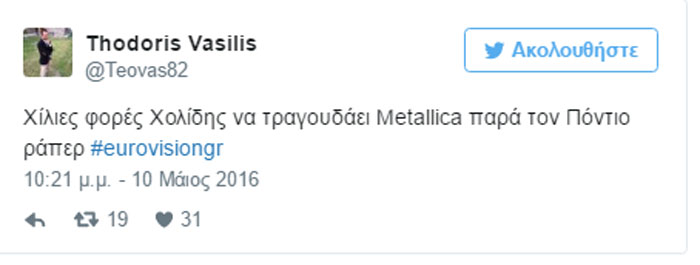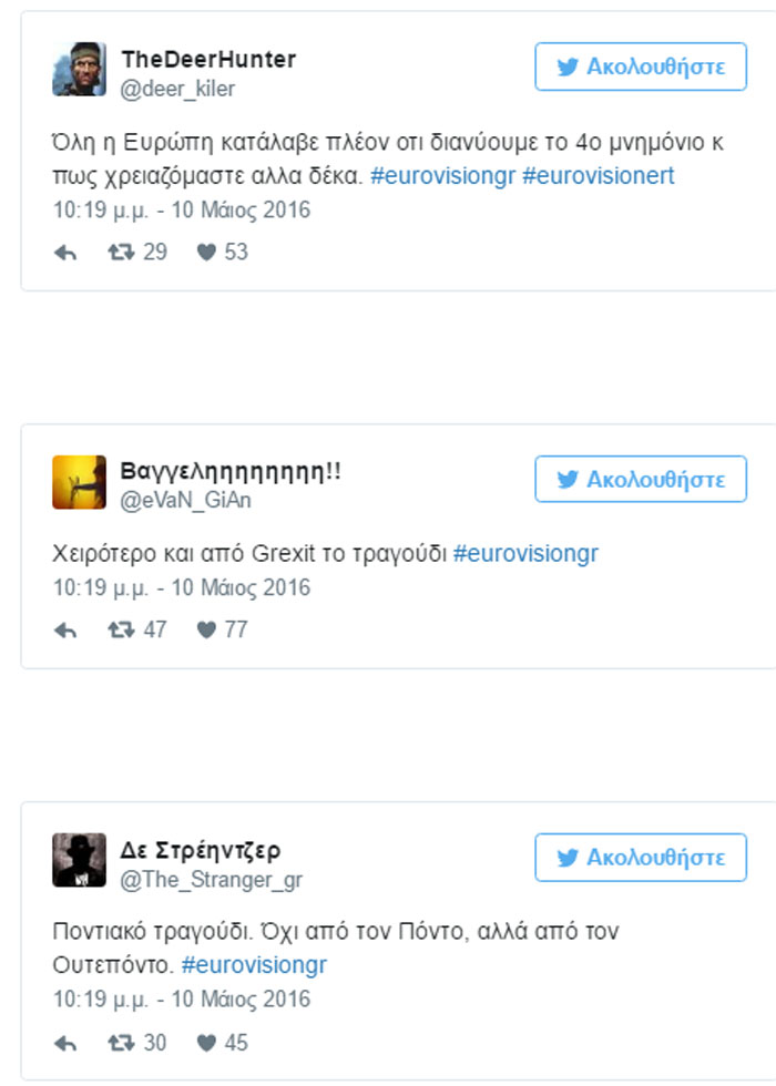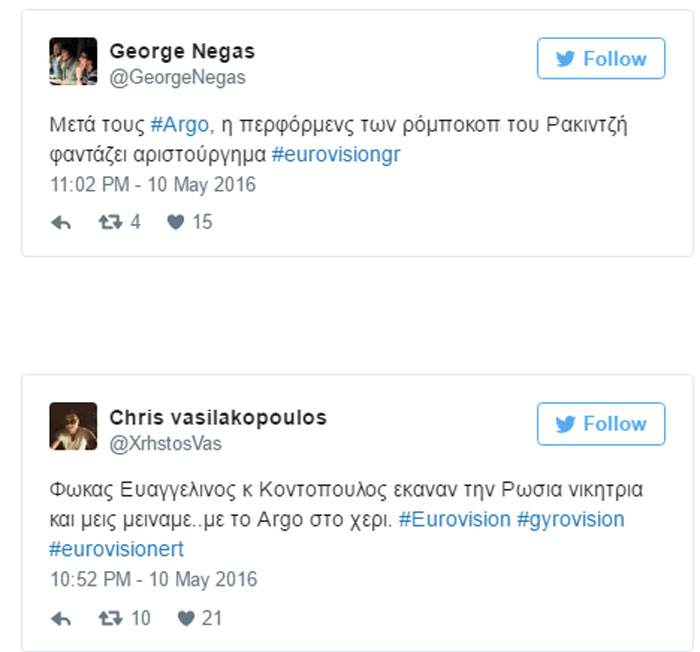 Τον δικό του «χορό» έδωσε το Τwitter στον ρυθμό των Argo για την εμφάνισή τους επί σκηνής Eurovision που οδήγησε και στον αποκλεισμό της Ελλάδας από τον τελικό του ερχόμενου Σαββάτου.
