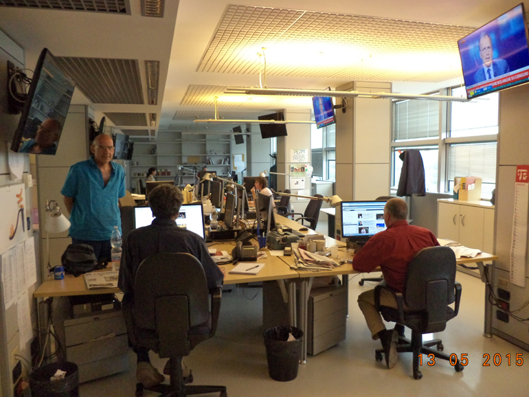 Oι Ιταλοί δημοσιογράφοι μας ξενάγησαν στους χώρους εργασίας τους, ενώ παράλληλα συζητήθηκε ο τρόπος συνεργασίας, σε δημοσιογραφικό επίπεδο, μεταξύ του zougla.gr και των συγκεκριμένων ιταλικών μέσων ενημέρωσης, όπως και η ανταλλαγή τεχνογνωσίας.