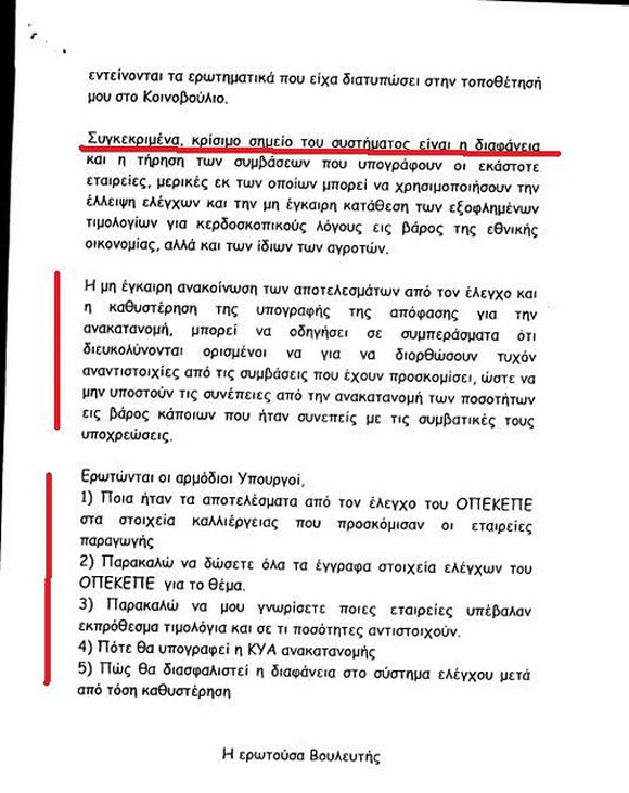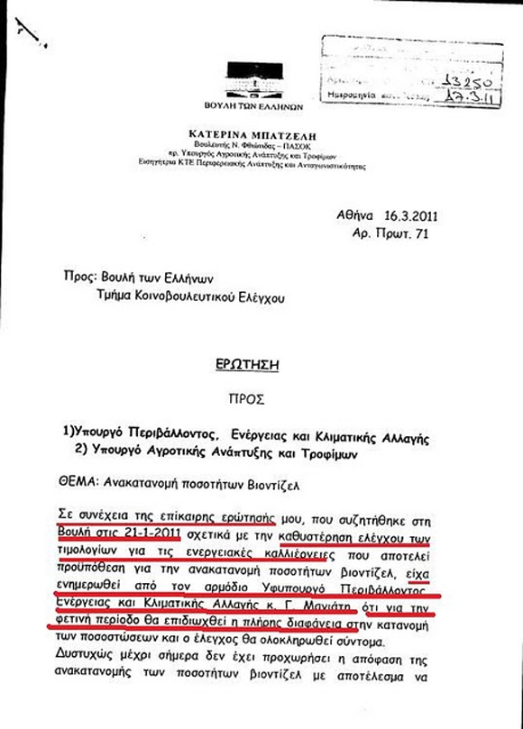 Το ζήτημα ετέθη στη Βουλή με Επίκαιρη Ερώτηση της βουλευτού ΠΑΣΟΚ, Κατερίνα Μπατζελή, στις 21-01-2011. Η βουλευτής και πρώην υπουργός Αγροτικής Ανάπτυξης, κατήγγειλε αδιαφανείς διαδικασίες, καθυστερήσεις στους ελέγχους και λανθασμένο τρόπο διαχείρισης του συστήματος κατανομής βιοκαυσίμων.