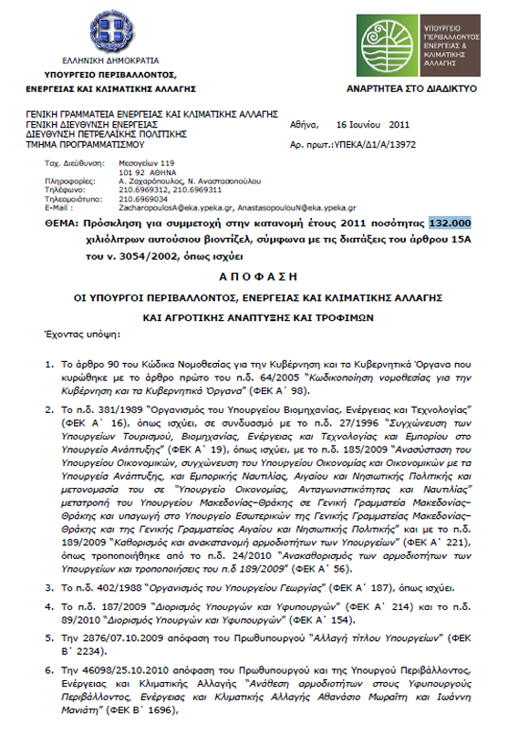 Για το 2010, με υπουργικές αποφάσεις, κατανεμήθηκε στις δικαιούχους εταιρείες ποσότητα 164 εκ. λίτρων βιοντίζελ, για την περίοδο από 1/7/2010 έως και 30/6/2011. (Κοινή υπουργική απόφαση (ΚΥΑ) (αριθμ. ΥΠΕΚΑ/Δ1/Α/ 15555/4.08.2010) με αρμόδιο Υπουργείο το Περιβάλλοντος, Ενέργειας και Κλιματικής Αλλαγής (ΥΠΕΚΑ) και συναρμόδια Υπουργεία το Αγροτικής Ανάπτυξης και Τροφίμων και το Υπουργείο Οικονομικών). Για το 2009, είχε κατανεμηθεί αντίστοιχα ποσότητα 182 εκ λίτρων.