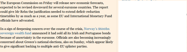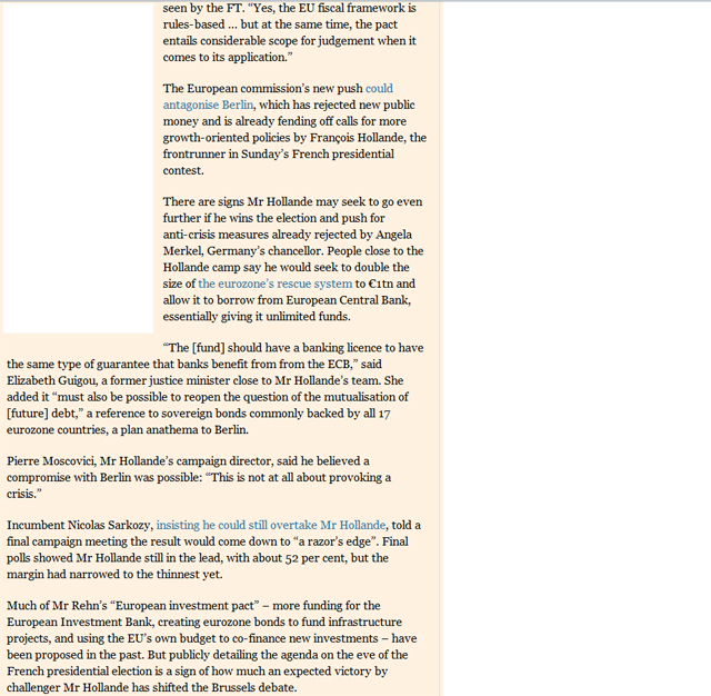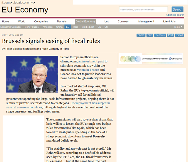 Οι «Financial Times», με νέο άρθρο τους το απόγευμα του Σαββάτου, αναφέρουν πως οι εκλογές σε Ελλάδα και Γαλλία σηματοδοτούν αλλαγή στην πολιτική της Ευρωπαϊκής Ένωσης αναφορικά με την αντιμετώπιση της κρίσης χρέους στην Ευρωζώνη.