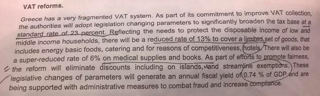 Όπως αναφέρεται στο σχετικό απόσπασμα του εγγράφου, «η Ελλάδα έχει ένα κατακερματισμένο σύστημα ΦΠΑ», ενώ υπογραμμίζεται ότι «θα δημιουργηθεί μία ευρεία φορολογική βάση που αφορά στον ΦΠΑ, με επιβολή ενός συντελεστή στο 23%».