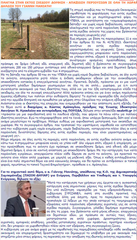 Το zougla.gr επικοινώνησε με τον πρόεδρο της Παν. Ομοσπονδίας Ιδιοκτητών Ακινήτων Στράτο Παραδιά ο οποίος δήλωσε ότι τη στιγμή που το υπουργείο Οικονομικών βάζει στον συμπληρωματικό φόρο να πληρώνουν και όλοι που έχουν εκτός σχεδίου ακίνητη περιουσία, την ίδια ώρα το υπ. Περιβάλλοντος με μία διάταξη που κανείς δεν καταλαβαίνει τι θέλει να πει, καταργεί την οικοδομησιμότητα σε έναν τεράστιο αριθμό γεωτεμαχίων σε όλη τη χώρα».