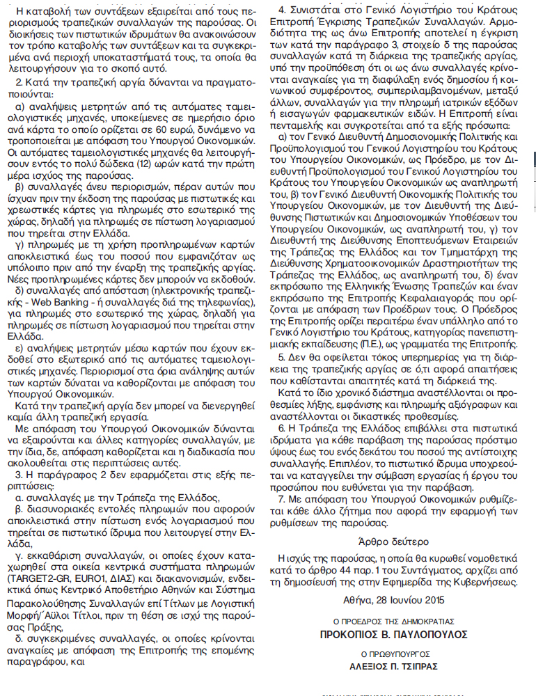 Με την πράξη νομοθετικού περιεχομένου που εκδόθηκε τα ξημερώματα της Δευτέρας, τουλάχιστον μέχρι την 6η Ιουλίου οι πολίτες δεν θα μπορούν να προσέρχονται στα γκισέ των τραπεζών. Το ανώτατο ημερήσιο όριο αναλήψεων από τα ATM διαμορφώνεται στα 60 ευρώ ανά κάρτα και λογαριασμό. Εάν, δηλαδή, διαθέτει κάποιος τρεις διαφορετικούς λογαριασμούς με αντίστοιχα τρεις διαφορετικές χρεωστικές κάρτες θα μπορεί να πραγματοποιεί ανάληψη μέχρι 180 ευρώ συνολικά.