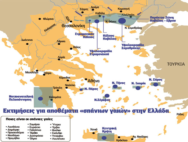 Επειδή τα υλικά αυτά είναι μεγάλου ειδικού βάρους, δεν μεταφέρονται σε μεγάλη απόσταση από τις ακτές, με αποτέλεσμα να βρίσκονται εντός των χωρικών υδάτων. Με βάση όλα αυτά, δεν αποτελεί έκπληξη ότι υψηλές συγκεντρώσεις Σπανίων Γαιών στην παράκτια ζώνη από την Καβάλα μέχρι τον Έβρο έχουν διαπιστωθεί ήδη από τη δεκαετία του ’80 από έρευνες που διεξήγε τότε το ΙΓΜΕ (για την ανεύρεση τιτανίου και ζιρκονίου).