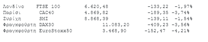Ακολουθεί πίνακας με την τελική διαμόρφωση των δεικτών δυτικοευρωπαϊκών χρηματιστηρίων, την αριθμητική διαφορά και την ποσοστιαία μεταβολή ως προς το αμέσως προηγούμενο κλείσιμο.