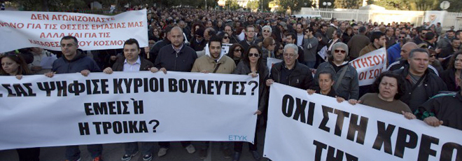 Οργή και αγανάκτηση επικρατεί στη Λευκωσία έπειτα από την οδυνηρή λύση που επέβαλαν οι εταίροι για την αποφυγή χρεοκοπίας και τη διάσωση της κυπριακής οικονομίας.