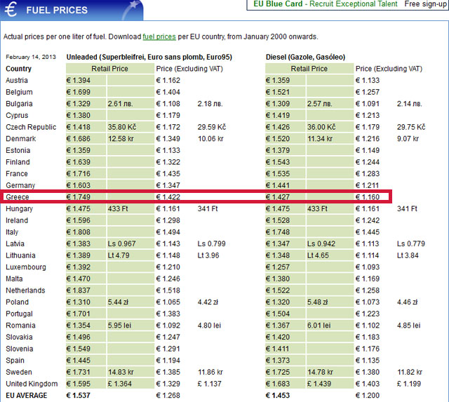 Σε ό,τι αφορά στην τιμή πώλησης του λίτρου, η Ελλάδα καταλαμβάνει την έκτη θέση της σχετικής κατάταξης. Συγκεκριμένα, οι Έλληνες δαπανούν το 15% του ημερομισθίου τους για την αγορά ενός λίτρου βενζίνης, ενώ συνολικά δαπανούν το 4,8% του εισοδήματός τους για τον ανεφοδιασμό του οχήματός τους.