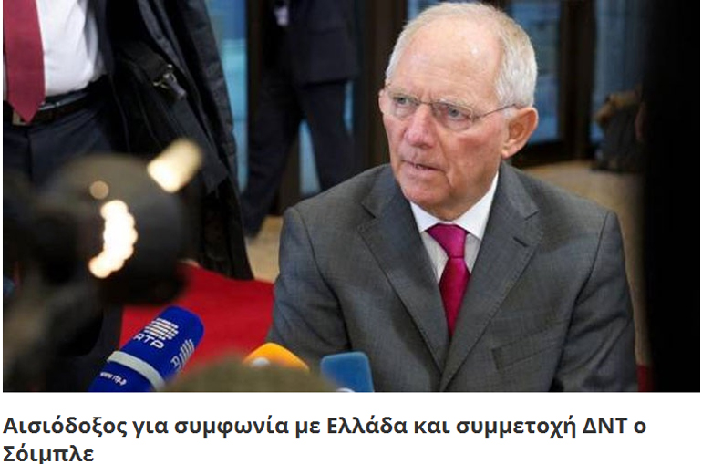 Στη θέση του περί μη ανάγκης κουρέματος εμμένει ο υπουργός Οικονομικών της Γερμανίας Βόλφγκανγκ ΣόιμπλεΣε γεύμα που παρέθεσε προς τιμήν του Γερμανού «σκληροπυρηνικού» υπουργού η εφημερίδα «Handelsblatt» ο Σόιμπλε δήλωσε ότι εξακολουθεί να μη βλέπει, όπως είπε, λόγο για ένα «πραγματικό κούρεμα» του ελληνικού χρέους, εξέφρασε ωστόσο την αισιοδοξία του για συμφωνία με το Eurogroup σε δύο εβδομάδες.