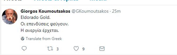 Εάν η Ελληνική Κυβέρνηση επιθυμεί να εργαστεί στο πλαίσιο των συμβατικών της υποχρεώσεων με την Ελληνικός Χρυσός, να εκδώσει έγκαιρα τις άδειες και να στηρίξει την επένδυση, τότε η Eldorado θα είναι σε θέση να επανεκτιμήσει τα επενδυτικά της σχέδια στη χώρα.»