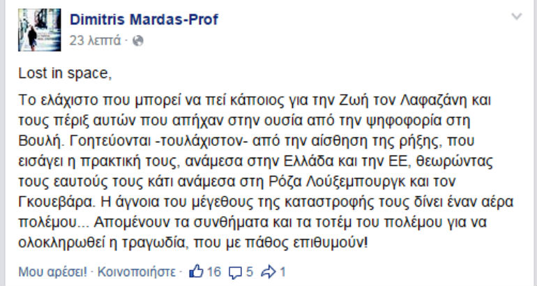Το ελάχιστο που μπορεί να πεί κάποιος για την Ζωή τον Λαφαζάνη και τους πέριξ αυτών που απήχαν στην ουσία από την ψηφοφορία στη Βουλή. Γοητεύονται -τουλάχιστον- από την αίσθηση της ρήξης, που εισάγει η πρακτική τους, ανάμεσα στην Ελλάδα και την ΕΕ, θεωρώντας τους εαυτούς τους κάτι ανάμεσα στη Ρόζα Λούξεμπουργκ και τον Γκουεβάρα. Η άγνοια του μεγέθους της καταστροφής τους δίνει έναν αέρα πολέμου… Απομένουν τα συνθήματα και τα τοτέμ του πολέμου για να ολοκληρωθεί η τραγωδία, που με πάθος επιθυμούν!