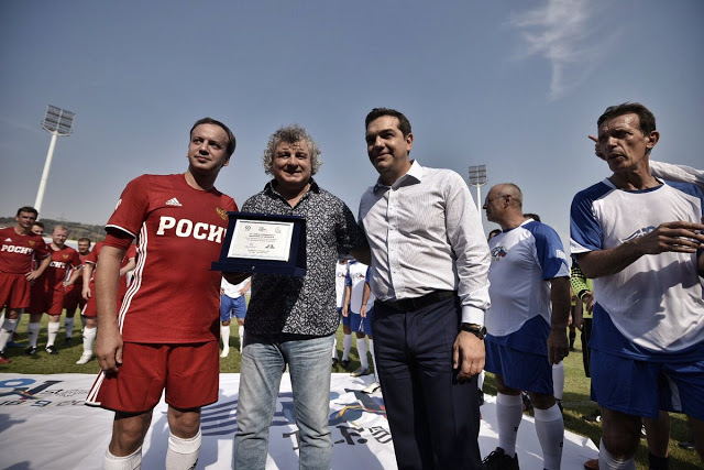 Στο Καυτανζόγλειο Στάδιο της Θεσσαλονίκης βρέθηκε ο Αλέξης Τσίπρας, μετά το πέρας της συνέντευξης Τύπου, για να παρακολουθήσει τον φιλικό αγώνα ανάμεσα σε βετεράνους ποδοσφαιριστές Ελλάδας και Ρωσίας.