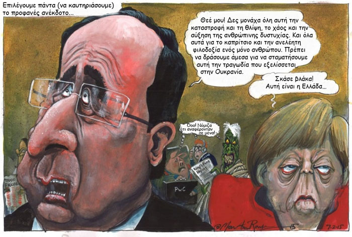Διαβάστε τον διάλογο μεταξύ του Γάλλου Προέδρου Φρανσουά Ολάντ και της Γερμανίδας Καγκελαρίου Άγκελα Μέρκελ, σε μια γελοιογραφία για το «προφανές ανέκδοτο» δηλαδή αυτό της… Ελλάδας.
