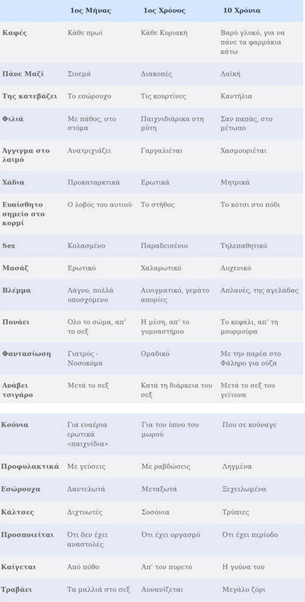 Όλοι στην αρχή, στο στάδιο ακόμη της γνωριμίας, προσπαθούν να βγάλουν τον καλό τους εαυτό. Καθώς ο χρόνος περνά, έρχεται η εξοικείωση και αργότερα η ρουτίνα και η βαρεμάρα, τα οποία αποτυπώνει με χιουμοριστικό τρόπο ο παρακάτω πίνακας: