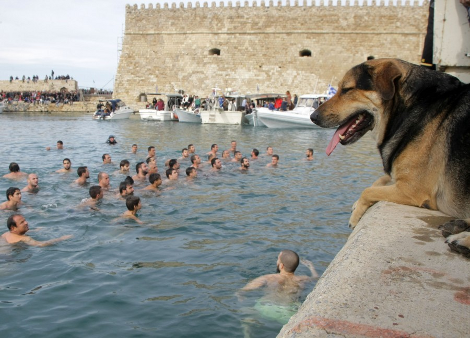 Tρία χρόνια τον περιμέναν να πέσει, τελικά φέτος το πήρε απόφαση και βούτηξε στα παγωμένα νερά του λιμανιού του Ηρακλείου για να πιάσει τον σταυρό. Ο λόγος για τον πιο «διάσημο» σκύλο του Ηρακλείου που εδώ και καιρό δίνει το παρών σε όλες τις εκδηλώσεις στην πόλη. Ετσι και σήμερα, ημέρα των Θεοφανείων βρέθηκε έξω από το Μητροπολιτικό Ναό του Αγίου Μηνά, ακολούθησε την πομπή και έφθασε μέχρι το λιμάνι.