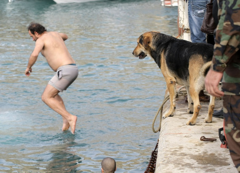 Όπως και τις προηγούμενες χρονιές, στάθηκε δίπλα στην εξέδρα και κοιτούσε τους ανθρώπους να βουτούν για το σταυρό. Φέτος όμως πήρε τη μεγάλη απόφαση και έπεσε στο νερό μαζί τους. Για να βγει στη στεριά πάντως χρειάστηκε και τη βοήθεια των άλλων κολυμβητών.