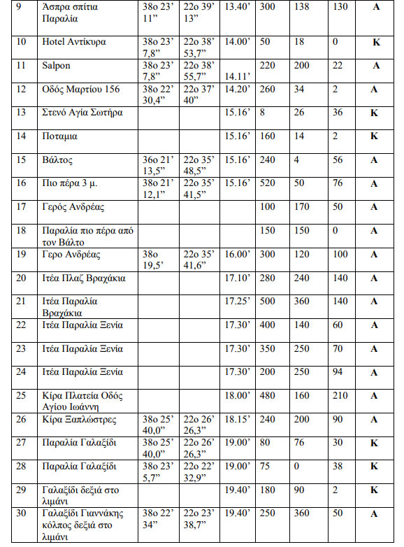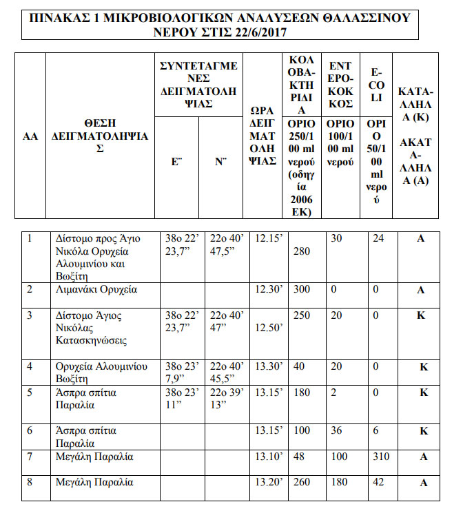 Πίνακας αποτελεσμάτων για την καταλληλότητα των νερών κολύμβησης και ανθρώπινης κατανάλωσης από το Γαλαξίδι Φωκίδας μέχρι τα Άσπρα Σπίτια Βοιωτίας.