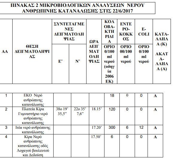 Πίνακας αποτελεσμάτων για την καταλληλότητα των νερών ανθρώπινης κατανάλωσης από το Γαλαξίδι Φωκίδας μέχρι τα Άσπρα Σπίτια Βοιωτίας