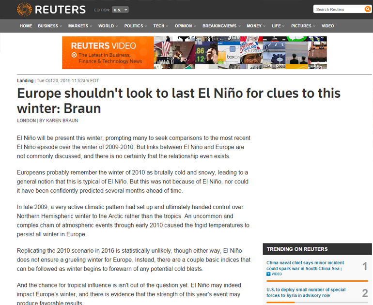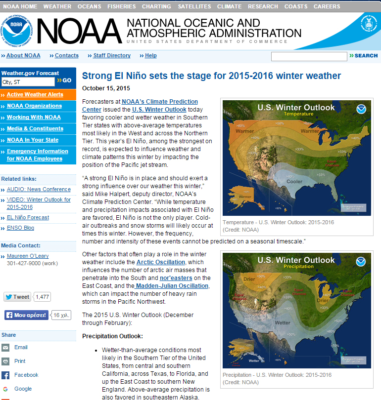 «Το Ελ Νίνιο έχει ξεκινήσει από πέρυσι και φαίνεται ότι θα κορυφωθεί τους επόμενους δύο μήνες. Όντως θα δημιουργήσει έντονα καιρικά φαινόμενα. Ωστόσο δεν έχει αποδειχθεί μέχρι σήμερα έντονος συσχετισμός του επεισοδίου Ελ Νίνιο με τον καιρό της Ευρώπης. Ακόμα είναι νωρίς να μιλήσουμε για βαρύ και ελαφρύ χειμώνα. Βεβαίως παρακολουθούμε την εξέλιξη του φαινομένου, το οποίο επηρεάζει τον καιρό του πλανήτη» επισημαίνει ο Μιχάλης Μυρσιλίδης, μετεωρολόγος της Εθνικής Μετεωρολογικής Υπηρεσίας.