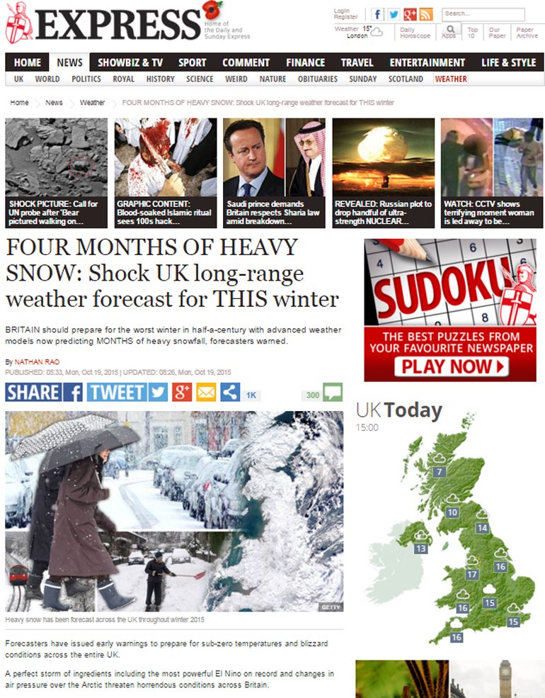 Ο Γερμανός μετεωρολόγος Ντομινίκ Γιουνγκ αναφέρει ότι «η χειμερινή σεζόν 2016 υπόσχεται να είναι ασυνήθιστα κρύα». Σύμφωνα με τον ίδιο, οι χαμηλότερες θερμοκρασίες θα καταγραφούν τους μήνες Ιανουάριο και Φεβρουάριο.