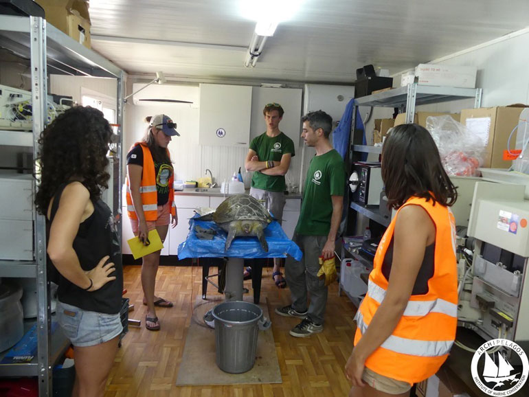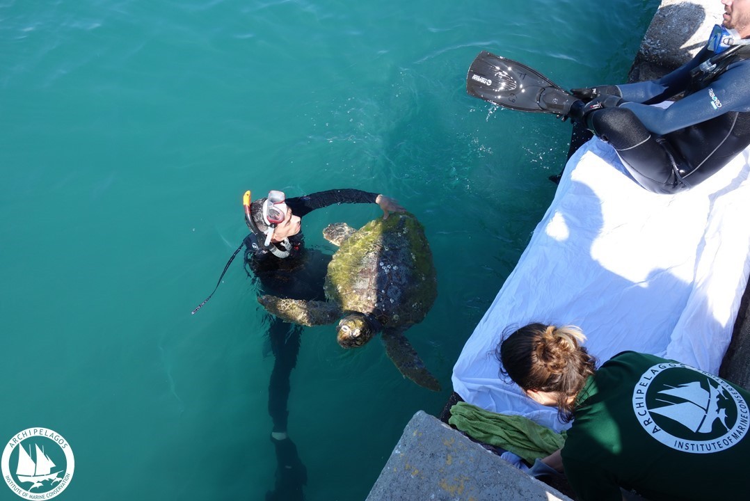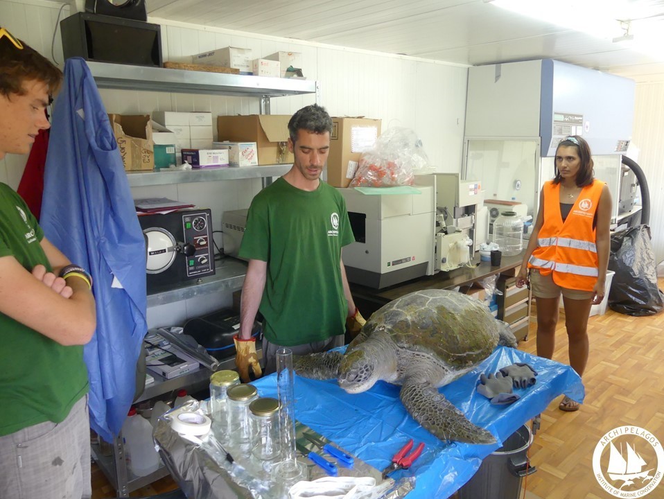 Μία από τις θαλάσσιες χελώνες που βρέθηκε ζωντανή, ήταν μπλεγμένη σε ένα πλαστικό τσουβάλι, στο οποίο είχε εγκλωβιστεί το ένα μπροστινό της πτερύγιο και ο λαιμός της, ενώ κομμάτια πλαστικού από το τσουβάλι είχαν εισχωρήσει μέσα στο στόμα και το φάρυγγά της. Η συγκεκριμένη χελώνα ήταν πολύ τυχερή, καθώς την εντόπισε εγκαίρως ένας ψαράς και έπειτα από λίγες ημέρες φροντίδας από τον κτηνίατρο του Ινστιτούτου Αρχιπέλαγος, μπόρεσε και πάλι να ελευθερωθεί στη θάλασσα.