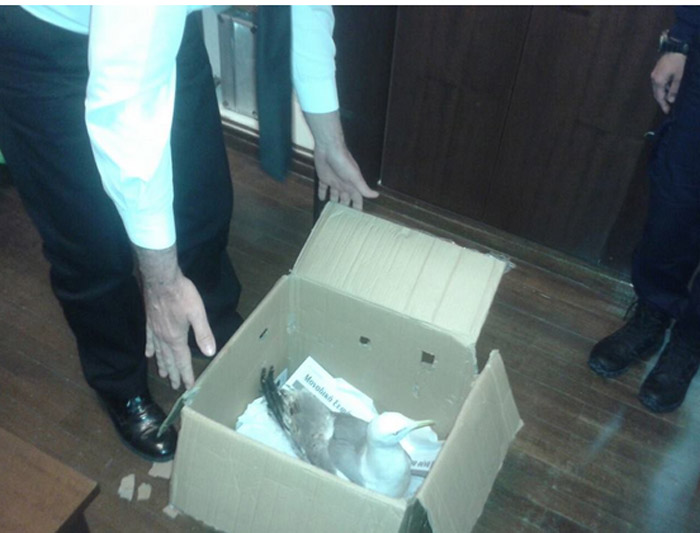 Λιμενικοί έσπευσαν στο σημείο και με προσοχή μετέφεραν το τρομαγμένο και τραυματισμένο πουλί στην υπηρεσία τους, όπου το κράτησαν μέχρι το πρωί. Ο λιμενάρχης Σπύρος Μαρίνος επικοινώνησε με τον Σύλλογο Προστασίας και Περίθαλψης Άγριας Ζωής ΑΝΙΜΑ παίρνοντας τις κατάλληλες οδηγίες για τη χορήγηση πρώτων βοηθειών και τη μεταφορά του.