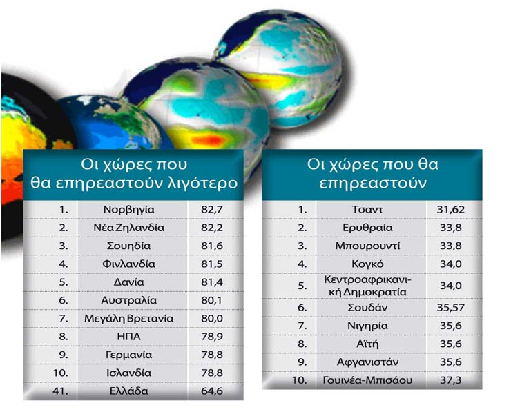Στο μείζον ζήτημα της κλιματικής αλλαγής και των επιδράσεών της στην ανθρωπότητα, η εταιρεία Eco Experts, χρησιμοποιώντας πληροφορίες από το Πανεπιστήμιο του Notre Dame στην Ιντιάνα των ΗΠΑ (γνωστοί και ως ND-Gain Index), αποτυπώνει σε χάρτες τις χώρες που θα επηρεαστούν περισσότερο ή λιγότερο.